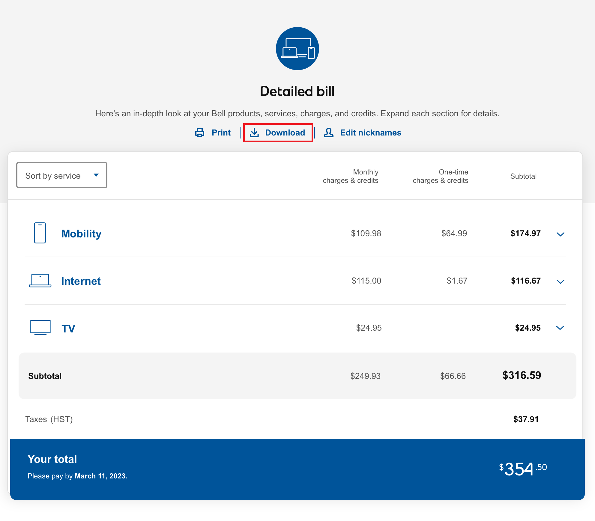 Upon logging in to MyBell, scroll down to your detailed bill located right below your bill summary.