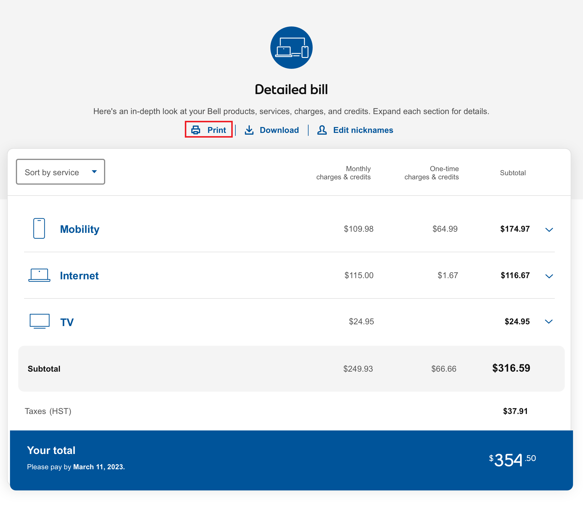 Select the Print option located in the header. You have the following options to print your bill: