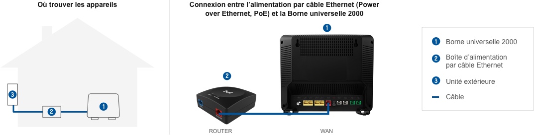 - Assurez-vous que le PoE est connecté au modem : le câble Ethernet doit être connecté à l'adaptateur PoE et au port WAN à l'arrière du modem