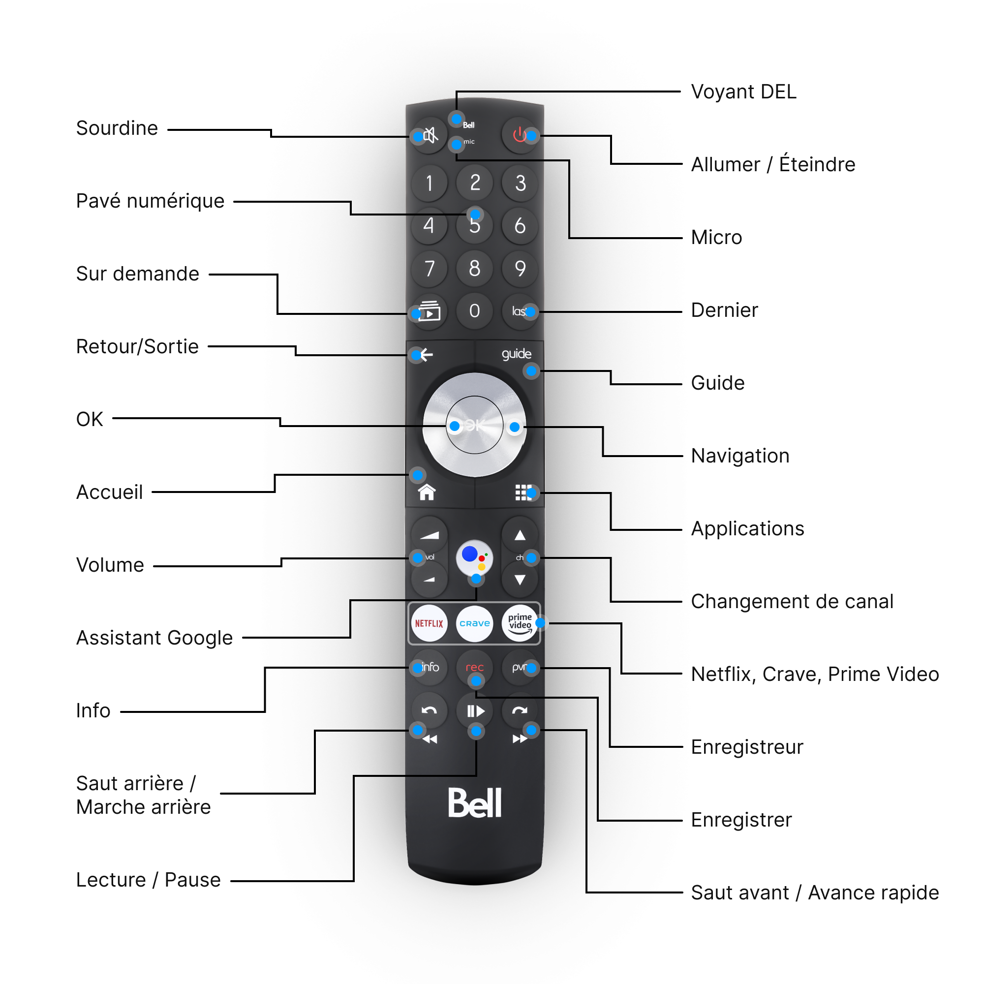 • Appuyez sur les boutons Netflix, Crave ou Prime Video pour accéder directement aux applications.